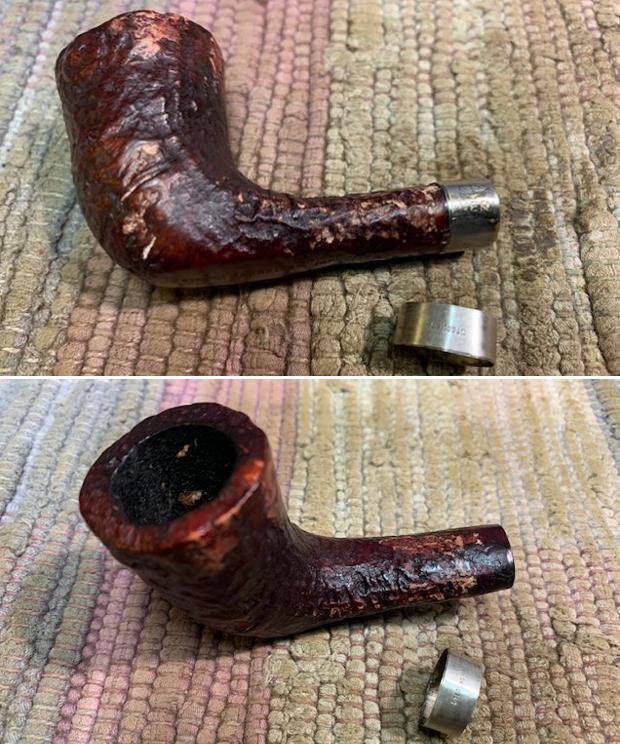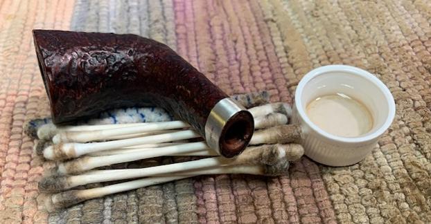 Undiluted Murphy’s Oil Soap is used with a cotton pad to scrub. The cotton pad is joined by a brass bristled brush to address the rim. Brass is used because it is less invasive to the briar during cleaning but gives a bit more muscle for stubborn grime on rims.