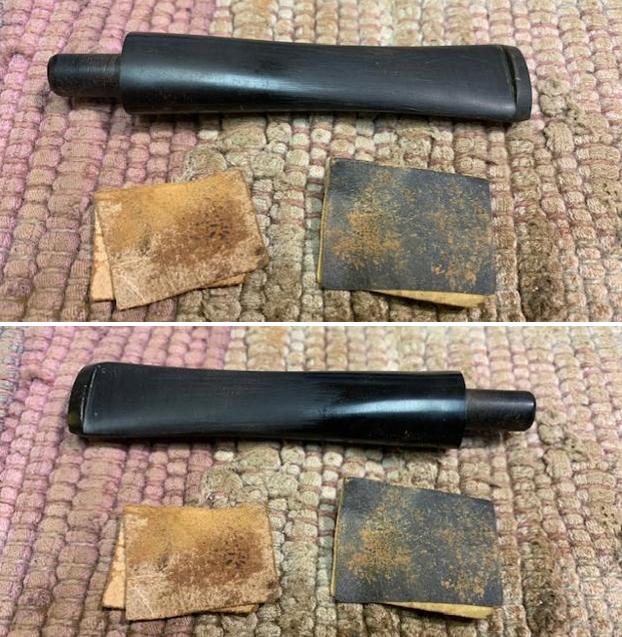 After the full 24-hour soak, the stem is removed from the liquid and first wiped with a dry cotton pad followed by a cotton pad wetted with alcohol. The cotton pads remove a lot of the raised oxidation. The airway is also cleaned with a few pipe cleaners wetted with isopropyl 99%. The oxidation seems to have been removed through the soaking process.
