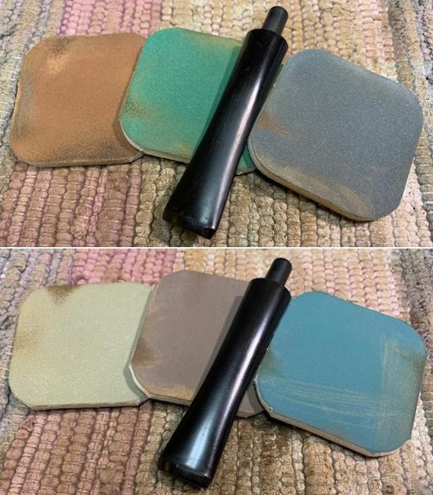 After the sanding sponges, the full regimen of micromesh pads is applied. Starting with wet sanding, pads 1500 to 2400 are used followed with dry sanding with pads 3200 to 4000 and 6000 to 12000. After the first six pads are used, the painter’s tape is removed from the shank protecting the Bennington nomenclature. The final 3 pads help to blend the resulting ‘spot’ some.