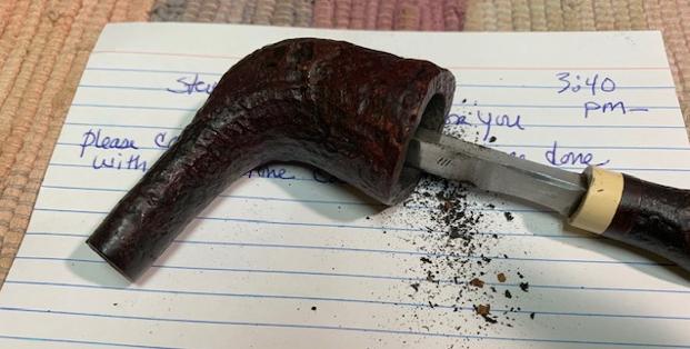 With the stem on the side, the cleaning is started on the Bennington stummel. Starting with the light carbon cake buildup, the chamber is reamed with 2 of the 4 blade heads available in the Pipnet Reaming Kit.