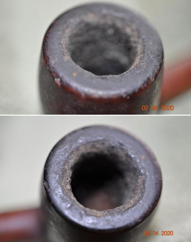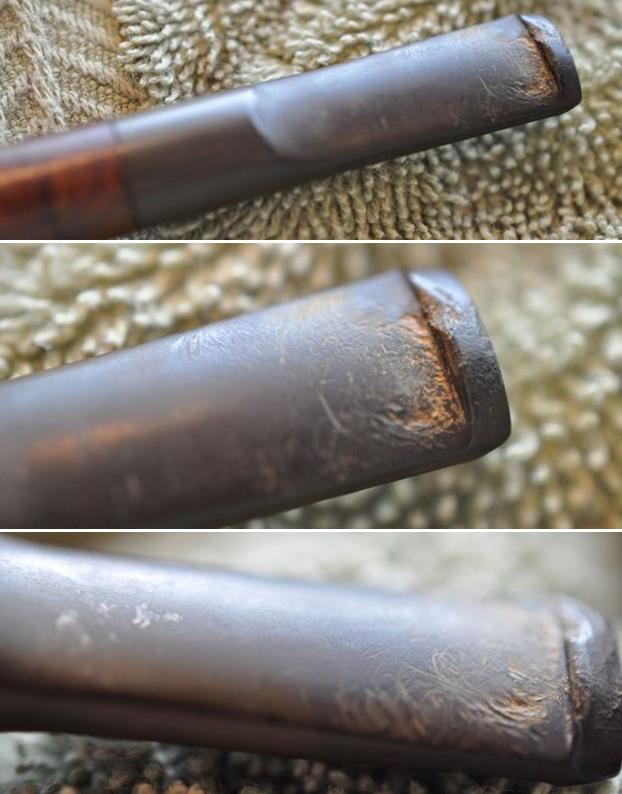 I took some close up photos of the rim top and the stem surface. The top and inner and outer edge of the rim were in rough condition. There was serious damage back outer edge of the bowl. The stem had deep tooth marks just ahead of the button and on the button surface.