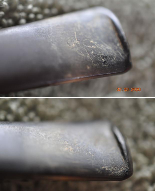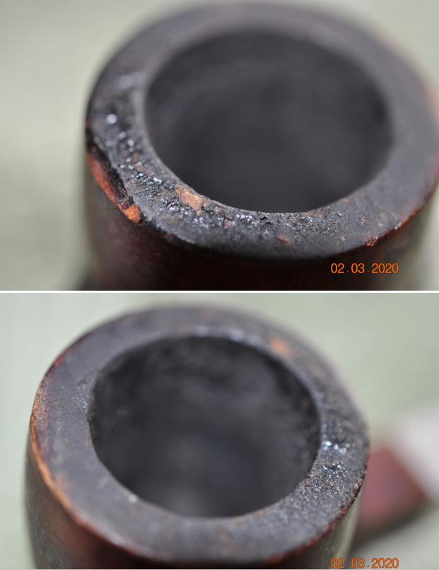 I took some close up photos of the rim top and the stem surface. The top and inner and outer edge of the rim showed damage. There was serious damage back outer edge of the bowl. The stem had tooth marks just ahead of the button and on the button surface.