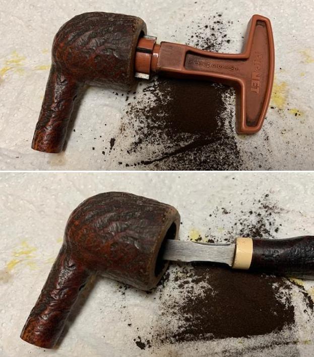 Jeff had done a great job cleaning up the pipe as usual. He reamed the pipe with a PipNet reamer and cut back the cake back to the bare briar. He cleaned up the walls with a Savinelli Fitsall Pipe Knife. He scrubbed the interior of the bowl and shank with pipe cleaners, cotton swabs and alcohol to remove the tars and oils. He scrubbed the exterior of the pipe with Murphy’s Oil Soap and a tooth brush to remove the grime from the finish. He worked on the rim top lava and darkening with the soap and tooth brush. He scrubbed the inside of the stem with alcohol and pipe cleaners. He scrubbed the exterior with Soft Scrub and then soaked it in Brairville’s Pipe Stem Deoxidizer. He washed it off with warm water to remove the deoxidizer. The pipe looked far better when it arrived.