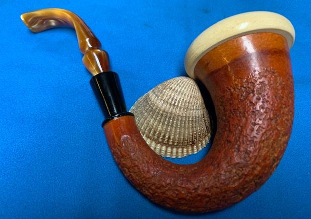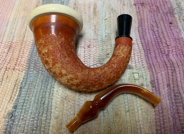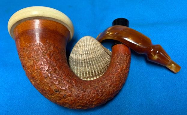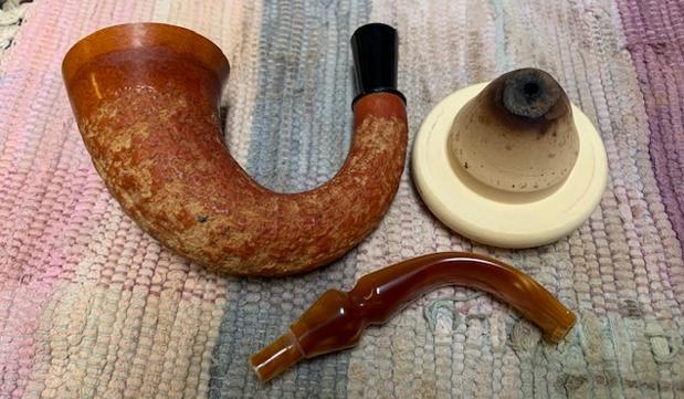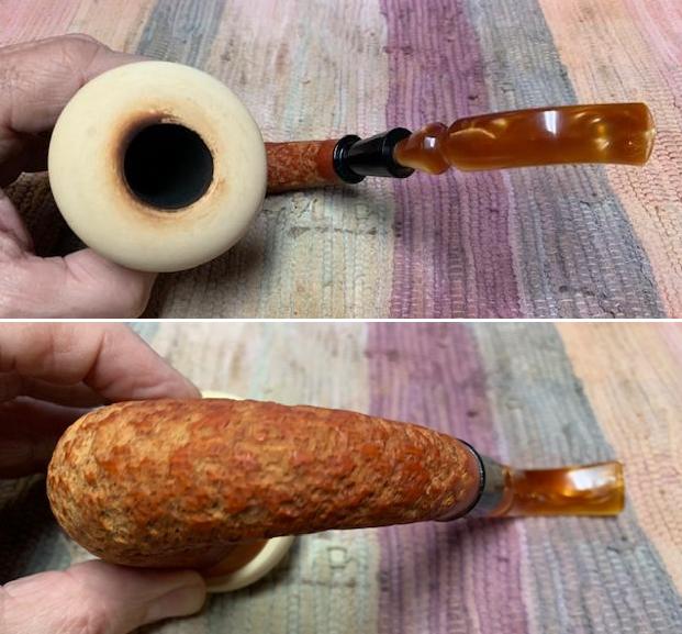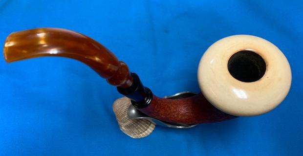 This Rusticated Gourd Calabash is an interesting looking pipe. The meerschaum bowl has developed a patina and the acrylic amber coloured stem looks very good with it.