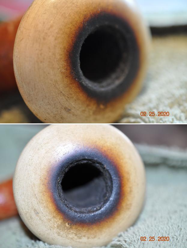 I started the process of cleaning up the meerschaum bowl by sanding the inner edge and the rim top with a folded piece of 220 grit sandpaper. I was able to remove the darkened edges and top with the sandpaper. It looked better after I worked on it.