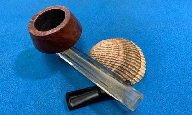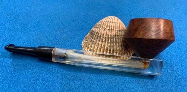 The next pipe on the table is a pipe that fits that. I remember when Jeff found it on one of his hunts in Utah. He called me and showed it to me on Facetime. It was one of those that we both just had to have. Not because it is a thing of beauty or a spectacular pipe by a well known pipe maker. It is not any of those things or even any number of other descriptions. It is just one that grabbed us and in our thinking deserved to be restored. It reminded us both of a Kirsten pipe. The square shank is made of Lucite and has a metal threaded nipple on the top that the bowl screws onto. The bowl is briar with a few fills around the sides and the base of the bowl. It has a brass threaded fitting in the bottom that screws onto the nipple. The shank tapers down into a vulcanite saddle stem with a regular push tenon. There was no clean out on the bowl end of the shank. It is a bit of an odd looking pipe but one that I understand the attraction. Can you imagine watching the smoke swirling up the clear shank while you smoke it? It must have been a fun pipe to smoke.