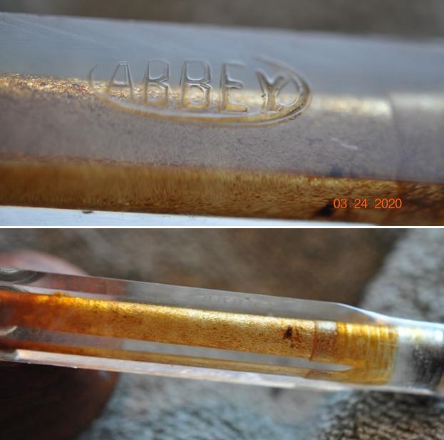We purchased it from an antique mall in Utah earlier this year. The briar bowl is natural coloured that has developed some patina. The base/shank is clear Lucite that is stained with tobacco juices. It was stamped on the left side and read Abbey in an oval. It was in filthy condition when Jeff brought it to the table which to me means that it must have been a good smoking pipe. There was a thick cake in the bowl and lava and debris rim top and the inner edge of the bowl. The vulcanite stem was lightly oxidized and had light tooth marks and chatter on the top and underside on and near the button. Jeff took photos of the pipe before his cleanup work to give a picture of its condition.