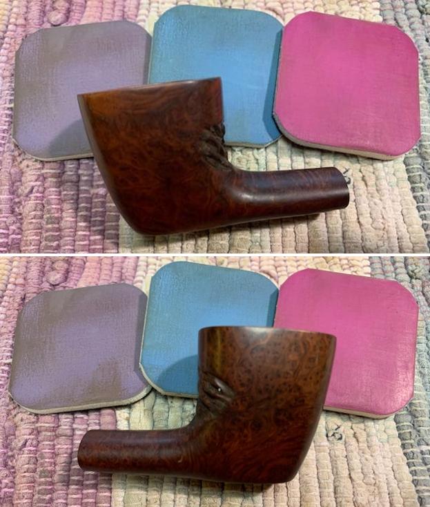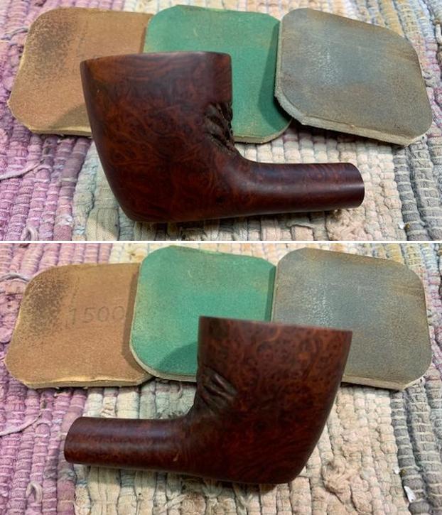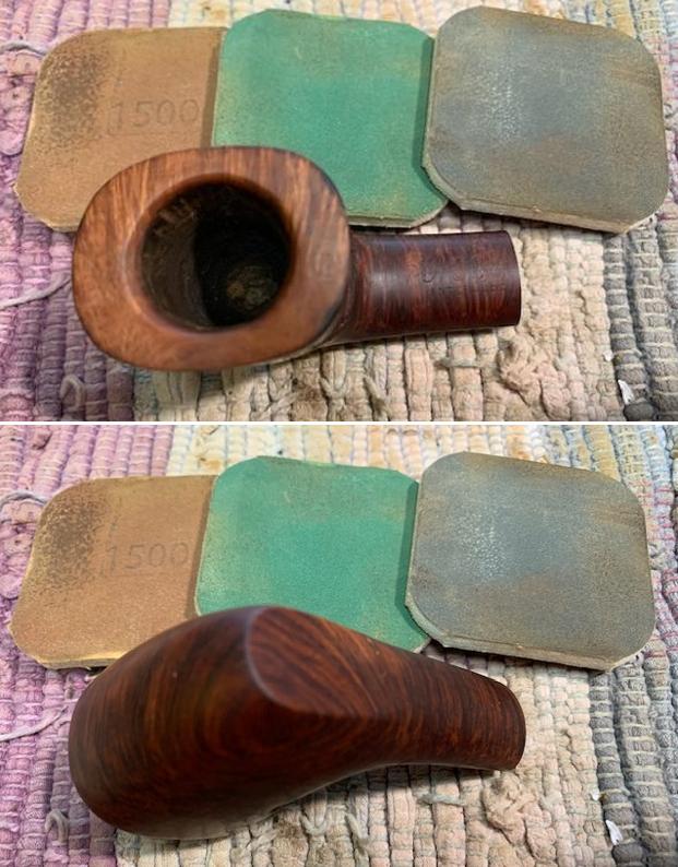 I repaired the flaw on the left side of the heel of the bowl with briar dust and super glue. Once it dried I sanded it smooth with 220 grit sandpaper to blend it into the surrounding briar.