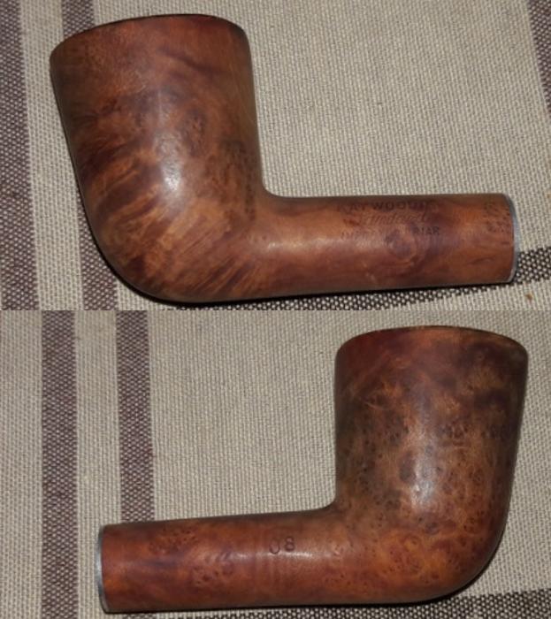 The lack of KB & B stamping in clover leaf over the shank surface and the three holed aluminum stinger, points to a later era Kaywoodie pipe. The shape code # 08 finds mention in the 1936 catalog as medium Dublin (indicated by the red arrow) and is conspicuous by its absence in the 1970s. (Refer Kaywoodie – Pipedia)