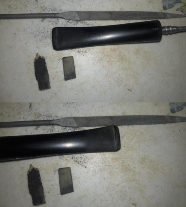 The next morning, I removed the stem that had been soaking in the deoxidizer solution overnight. I cleaned the stem and the stem airway under running warm water and scrubbed the raised oxidation from the stem surface using a Magic Eraser pad followed by scotch brite pad. I cleaned the stem airway with a thin shank brush and blew through the airway to completely remove the deoxidizer solution. I further removed the oxidation by scrubbing the stem with 0000 grade steel wool and applied a little EVO to rehydrate the stem.