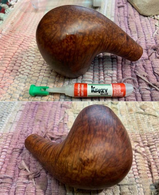 The bowl of the pipe was in excellent condition and did not need any work. The only major issue on the pipe was the hole in the top of the stem. I greased a pipe cleaner with Vaseline and slid it into the slot under the hole in the stem top. I filled in the hole with clear super glue. Once the glue cured it was a white spot that needed more work to blend into the stem surface. Once the repair cured I sanded the repair with 220 grit and polished it with 400 grit wet dry sandpaper.