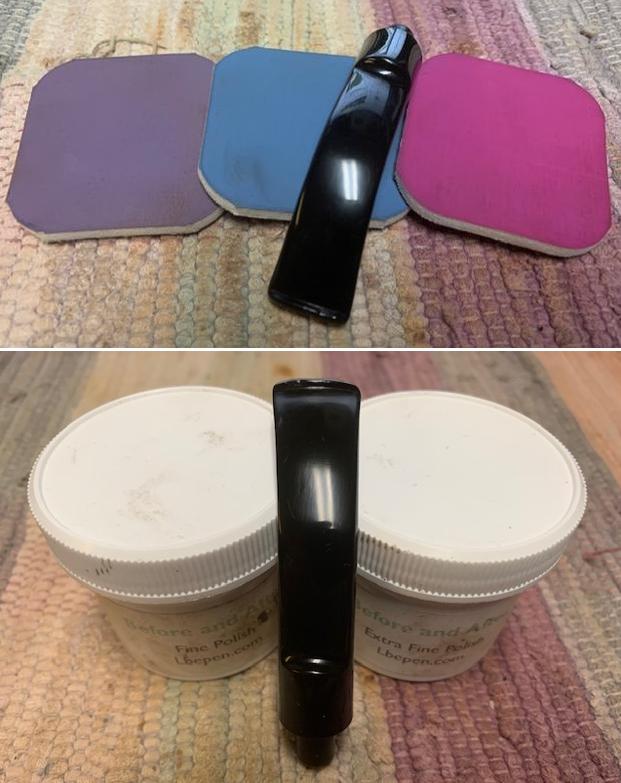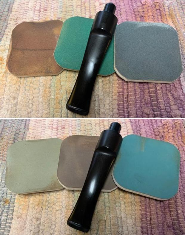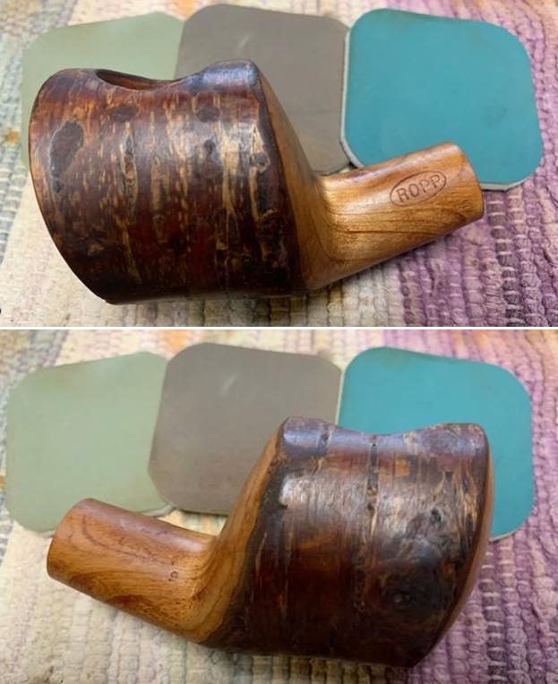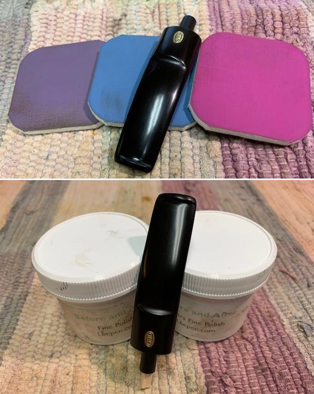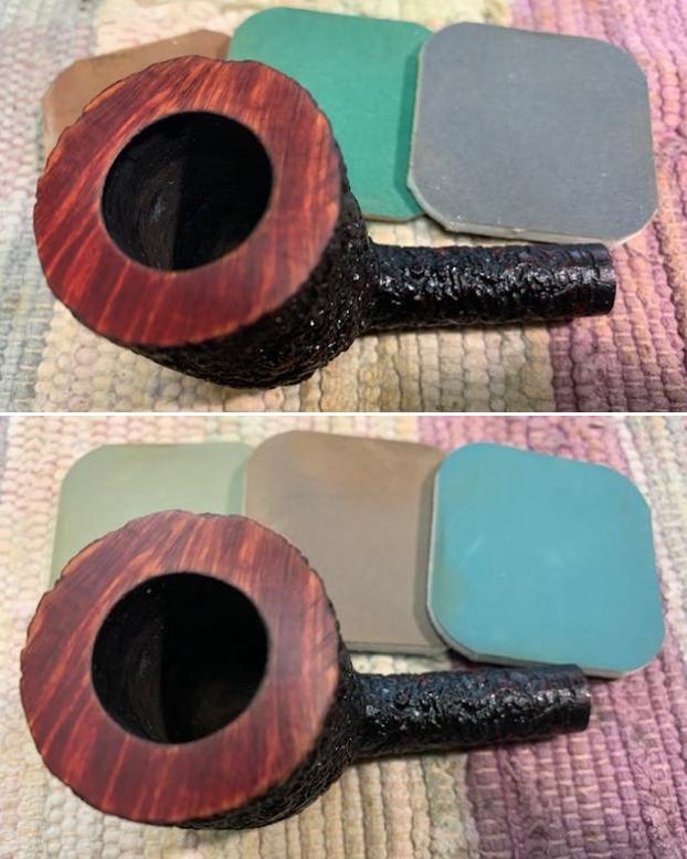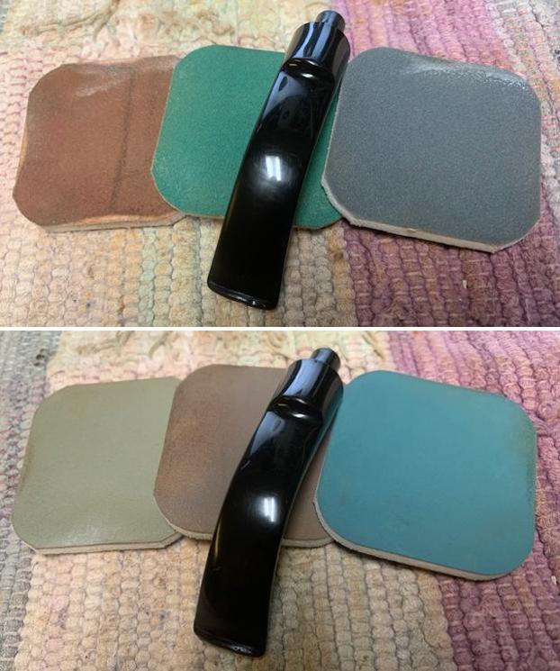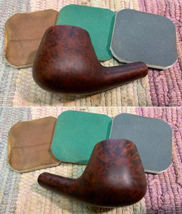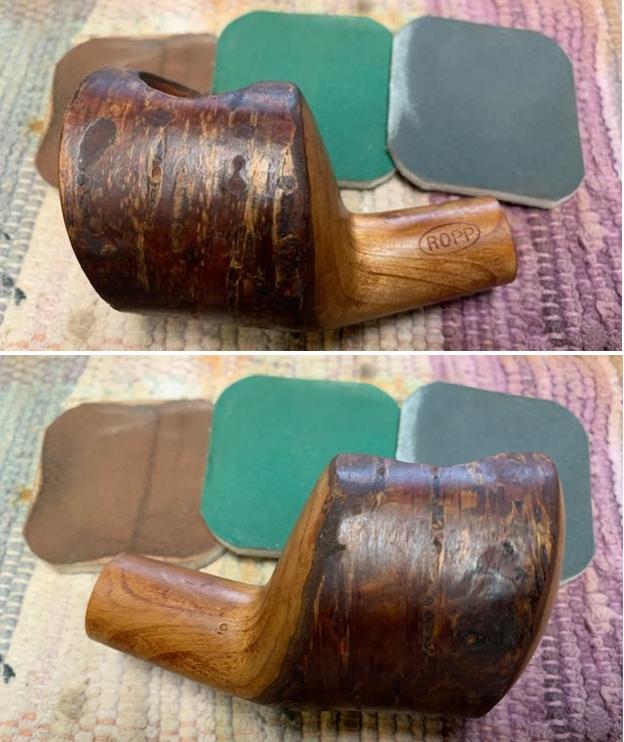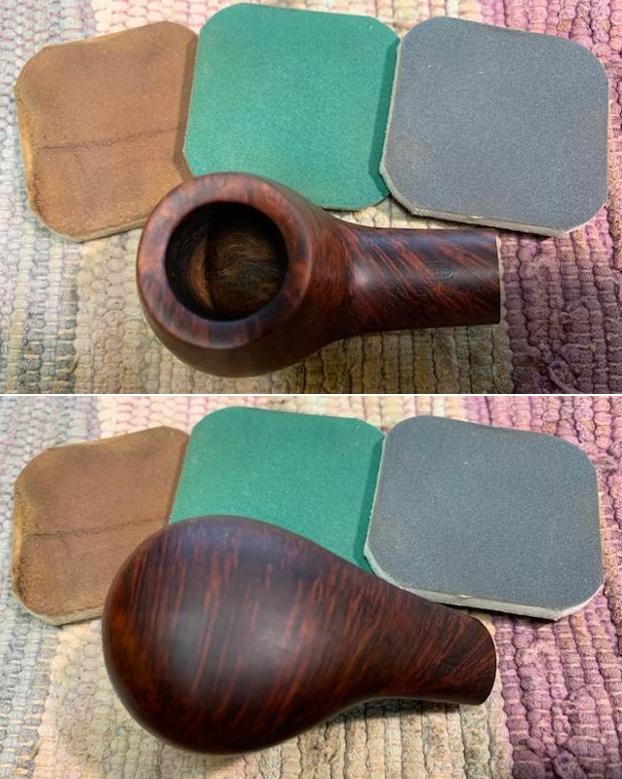 To remove the shiny varnish coat on the smooth briar side of the bowl and shank I sanded it with micromesh sanding pads, dry sanding with 1500-12000 grit sanding pads and wiping it down with damp cloth after each sanding pad. I decided to leave the dress black side alone preferring to leave the small nicks on the bowl surface rather than trying to match them to the black of the bowl finish.