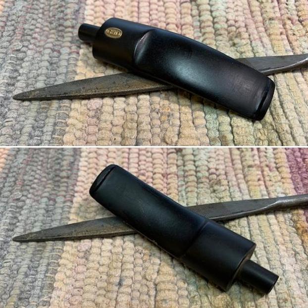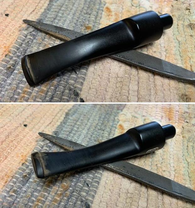 I used a small file to reshape the button, cut the sharp edge and flatten out the repairs. It worked amazingly well. The topside was perfect and the bit through was far better than I expected. I sanded the repaired areas with 220 grit sandpaper blend them into the surrounding surface of the stem and started polishing the stem with 400 grit wet dry sandpaper.