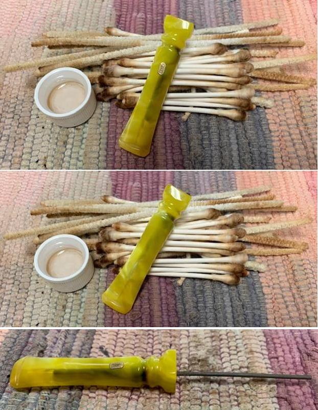 I set the bowl aside and worked on the stem. I greased a pipe cleaner with Vaseline and inserted it in the stem below the bit through. Once I had it situated I had a decision to make. The bite through was centered on the underside of the stem surface evenly split between tan and black. I decided to do the repair with clear CA glue hoping that it would pick up the colour of the underlying material. In the best case scenarios it works very well. In this case it went a bit crazy. The repairs cured over both areas in a milky white colour! Fortunately I overfilled the repairs so I was hoping that once I filled them and sanded them the repair would at least be less noticeable.