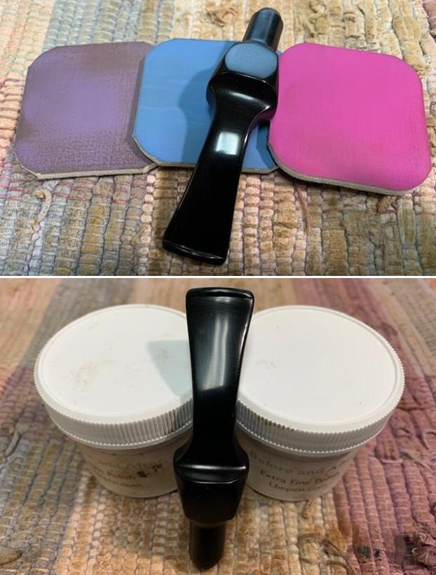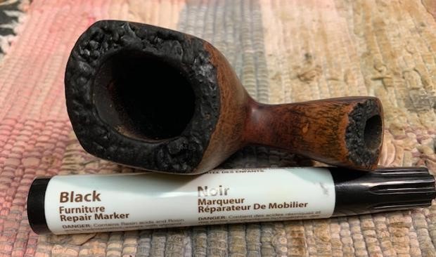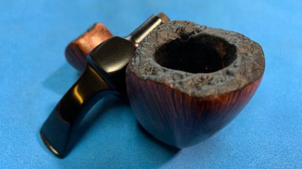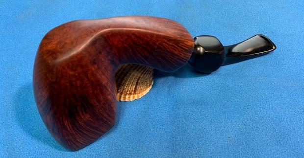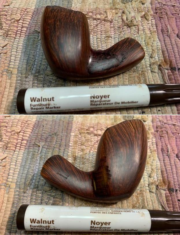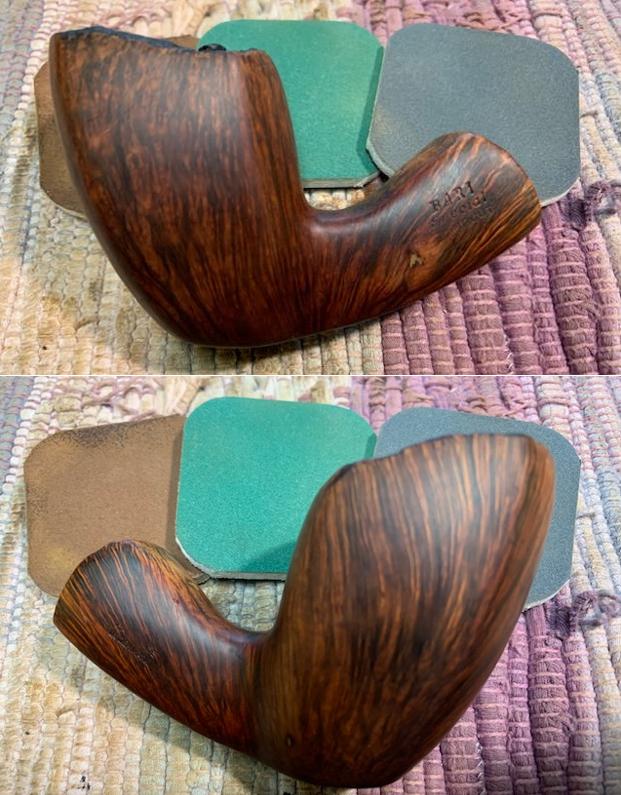 I did a quick look at Pipephil’s site (http://www.pipephil.eu/logos/en/logo-b1.html) and did a screen capture of the section on Bari pipes.Jeff had cleaned up the pipe following his normal cleaning process. In short, he reamed the bowl with a PipNet pipe reamer and cleaned up the reaming with a Savinelli Fitsall Pipe Knife. He scrubbed the smooth bowl with undiluted Murphy’s Oil Soap with a tooth brush. He worked over the lava and debris on the rim top and was able to remove it. He rinsed it under running warm water to remove the soap and grime. He cleaned out the inside of the shank and the airway in the stem with alcohol, cotton swabs and pipe cleaners. He scrubbed the stem with Soft Scrub and cotton pads to remove the debris and oils on the stem. He soaked it in a bath of Briarville’s Pipe Stem Deoxidizer to remove the oxidation. He rinsed it with warm water and dried it off. I took photos of the pipe once I received it. It really looked good however, surprisingly there were a number of fills around the shank and bowl. I took close up photos of the stem and the rim top to show both how clean they were and what needed to be addresses with both. The rim top and bowl look good. The edge was clean but there was some burn damage on the rim top at the back of the bowl. The stem looked better and the tooth marks and chatter were still present.I took a photo of the stamping on the sides of the shank. You can see from the photos that it is readable. I removed the stem from the bowl and took a photo of the parts to give a sense of the beauty of the pipe. I started my work on the pipe by addressing the damage to the back of the plateau rim top. Notice that it is burned but the grooves and crevices are still present. I cleaned it up with a brass bristle wire brush to remove as much of the loose char as possible. Once it was clean I used several burrs on my Dremel to redefine the grooves and crevices in the plateau at the back of the rim top. Once I was finished I was happy with the look or the rim top. I restained the rim top with a black stain pen to match the plateau on the shank end. I polished the smooth briar with micromesh sanding pads – dry sanding with1500-4000 grit pads to smooth out the surface of the briar and the noticeable fills around the shank and bowl. I wiped the bowl down after each sanding pad with a damp cloth to remove the sanding dust. The briar began to take on a shine. I paused after polishing the bowl with the 4000 grit micromesh pad to stain the fills around the sides of the shank and bowl. I used a Walnut stain pen to match the surrounding briar. Once the stain cured I finished polishing the bowl with 6000-12000 grit micromesh sanding pads. The bowl really did begin to shine. I rubbed the bowl down with Before & After Restoration Balm working it into the briar with my finger tips and into the plateau on the shank end and rim top with a horsehair shoe brush. The product works to clean, revive and protect the briar. I let it sit on the pipe for 10 minutes then buffed it off with a soft cloth. I set the bowl aside and turned my attention to the stem. I “painted” the stem surface with the flame of a lighter to lift the deep tooth marks in the vulcanite. Since vulcanite has “memory” I was able to lift the marks on the top and underside of the stem significantly. There were a few that did not lift completely so I filled them in with clear CA glue and set the stem aside to cure. Once the repairs cured I sanded it with 220 grit sandpaper to blend them into the surface and started polishing the stem with 400 grit wet dry sandpaper. I polished the stem with micromesh sanding pads – wet sanding it 1500-12000 pads. I wiped it down with some Obsidian Oil each pad to remove the dust and polishing debris. I polished it with Before  After Pipe Polish – both Fine and Extra Fine. I gave it a final coat of Obsidian Oil and set it aside to dry. This is another pipe that I am really happy about the finished restoration. This Odd Bari Special Handcut Freehand 72 00 turned out beautifully. It really is a great looking pipe with a great shape and rugged plateau rim top and shank end. The bowl is almost square and the shank is the same with virtually the same angles as the bowl from bottom to top. The unique vulcanite saddle stem carries on the shape to the end. The polished black of the stem works well with the briar. The briar really came alive with the buffing. The rich black and brown stains of the finish make the grain really pop with the polishing and waxing. I put the stem back on the bowl and buffed the pipe with Blue Diamond on the buffing wheel using a light touch on the briar. I gave the bowl and the stem multiple coats of carnauba wax on the buffing wheel. I buffed the pipe with a clean buffing pad to raise the shine. I hand buffed the pipe with a microfiber cloth to deepen the shine. The finished Bari Special Freehand really has a unique beauty and feels great in the hand. It looks very good. Give the finished pipe a look in the photos below. The dimensions of the pipe are Length: 6 ½ inches, Height: 2 ¼ inches, Outside diameter of the bowl: 1 ¾ inches long x 1 ½ inches wide, Chamber diameter: ¾ of an inch. The weight of the pipe is 70 grams/2.47 oz. The pipe will be going on the rebornpipes store soon. It will be in the section on Danish Pipe Makers if you would like to add it to your collection. Thanks for reading this blog and my reflections on the pipe while I worked on it. It was a fun one to work on!