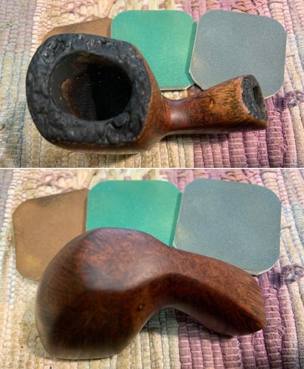 The next pipe on the work table is one that was purchased in 2020 from an auction in Salina, Kansas, USA. It has been here for a while and I am just now getting to it. Work has been demanding so it is slowing down my restoration work a bit. This pipe is a Bari Special Handcut Freehand. It has a really mix of flame and straight grain around the bowl and shank. It was stamped on the sides of the shank. On the left side it reads Bari [over] Special [over] Handcut. On the right side it reads Handmade [over] in Denmark. On the underside of the shank it is stamped with the numbers 72  00. The pipe was dirty with grime ground into the finish. There was a thick cake in the bowl and lava overflow on the plateau rim top. The inner edge of the rim was covered so thickly in lava it was hard to know what was underneath. The square saddled vulcanite stem was oxidized and had tooth marks and chatter ahead of the button on both sides. BARI was stamped on the left side of the fancy saddle stem. Jeff took photos of the pipe before he started his work on cleaning it up for us. Jeff took photos of the rim top and the stem to show the condition of the pipe when we received it. You can see the thick cake in the bowl and the lava on the rim top and inner edge of the bowl. The bowl is square while the chamber is round. The oxidized and calcified vulcanite stem was quite unique and picked up the square angles of the bowl and the shank. It has chatter and deep tooth marks on both sides near the button. He took photos of the sides of the bowl and the heel to give an idea of the shape and the condition of the briar around the bowl. It really is a nicely shaped pipe with some great grain. The next photos Jeff took show the stamping on the sides of the shank. It is clear and readable as noted above. The stem logo is also clear. Jeff took a photo of the partial plateau on the shank end. The top two thirds of the shank end was plateau while the bottom third was smooth. It is quite nice.I worked on a Bari Special Handcut pipe previously so I looked up the blog to refresh myself on the brand a bit (https://rebornpipes.com/2020/07/22/cleaning-up-a-danish-made-bari-special-handcut-b-dublin-freehand/). I quote from the research I did for that pipe below: