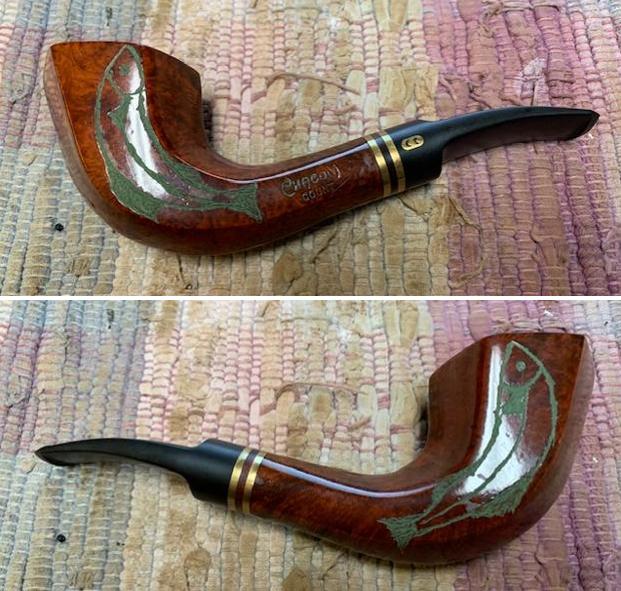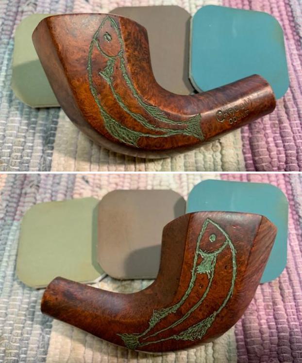The title on this blog really says it all for me. This next six sided pipe was purchased from an auction in Columbus, Michigan, USA in 2020. Jeff saw it and actually went for it even though he knew I would not like it at first. It was just too much to take in but he picked it up for a good price. It is carved on each side of the bowl with a rising fish. I do not know if the pipeman carved them or if it came that way but it was strange to me! On top of that, the carved fish are then stained with a wash of green as is the stamping on the shank side that reads Chacom [over] Count. It is stamped on the underside of the shank with the shape number 875. If that was all of the unusual features of this pipe that would be enough but there were more unique modifications. The previous pipe man must have like the P-lip feature on Peterson’s pipes because he drilled a round hole in the top of the stem ahead of the button and filled in the slot in the button with what looks like spray foam. Other than the modification the shape was unique and the shiny finish, though dirty, was in good condition. There was a light cake in the bowl and some lava on the back side of the rim top. There was also a bit of damage on the front inner edge and rim top where it appeared that the varnish coat had peeled. The twin brass ringed stem was oxidized and had some calcification. There were light tooth marks and chatter on both sides. The drilled hole was clean and undamaged. The spray foam oozing from the slot on the stem end was hardened and quite ugly. Jeff took some photos of the pipe before he started his cleanup.