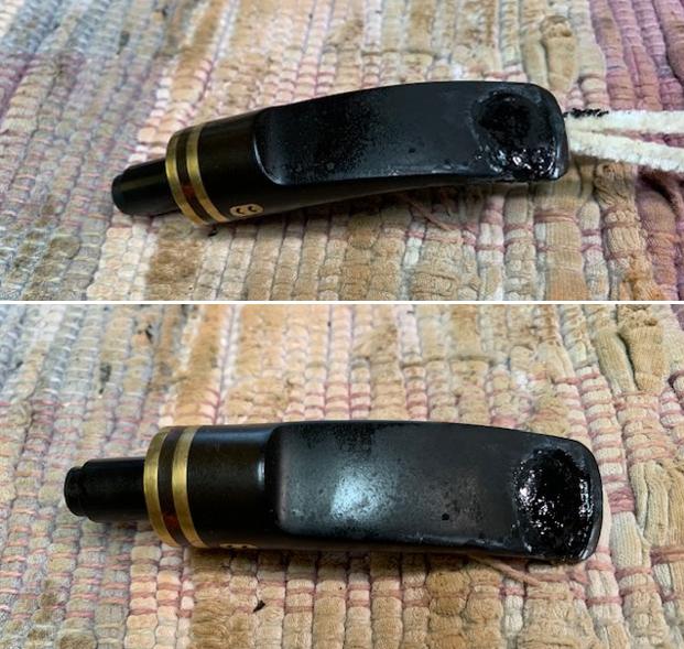 I set the bowl aside and turned my attention to the stem. Jeff had gotten the spray foam plug out of the slot in the button so I needed to address the drilled hole on the topside of the stem. I greased a pipe cleaner with Vaseline and slipped it into the stem below the hole. I wanted to have a base to build over but I did not want the cleaner to be glued in place. I mixed a batch of charcoal powder and black super glue and made a thick paste with it. I applied it to the surface of the stem with a dental spatula and made sure it was in the hole. I sprayed it with an accelerator to harden the CA glue enough that I could remove the pipe cleaner without pulling out the patch. I remove it and set the stem aside to cure for what I thought would be overnight but ended up being two days! It was as hard as a rock.