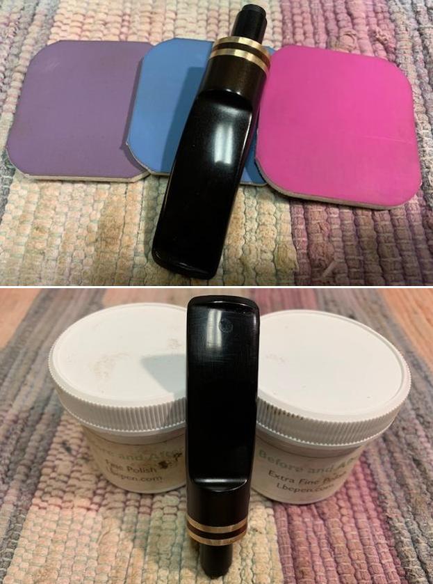 I rubbed the bowl down with Before & After Restoration Balm working it into the briar and the carving with my finger tips. The product works to clean, revive and protect the briar. I let it sit on the pipe for 10 minutes then buffed it off with a soft cloth.