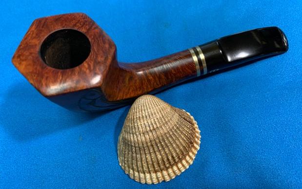 This pipe has some great grain under the varnish and I have to say that the carving of the fish kind of grew on me during the restoration. This Chacom Count Hexagon Scoop turned out really well. The bowl and shank are hexagonal and the fish carved on the sides look a lot better now. The polished twin brass bands, exotic wood spacer and black of the stem works well with the briar. The grain in the briar really came alive with the buffing. The rich brown stains of the finish make the grain really pop with the polishing and waxing. I put the stem back on the bowl and carefully buffed the pipe with Blue Diamond on the buffing wheel. I gave the bowl and the stem multiple coats of carnauba wax on the buffing wheel. I buffed the pipe with a clean buffing pad to raise the shine. I hand buffed the pipe with a microfiber cloth to deepen the shine. The finished Chacom Count really has a unique beauty and feels great in the hand. It looks very good. Give the finished pipe a look in the photos below. The dimensions of the pipe are Length: 6 ½ inches, Height: 2 ¼ inches, Outside diameter of the bowl: 1 ¾ inches, Chamber diameter: ¾ of an inch. The weight of the pipe is 71 grams/2.54 oz. The pipe will be going on the rebornpipes store soon. It will be in the section on French Pipe Makers if you would like to add it to your collection. Thanks for reading this blog and my reflections on the pipe while I worked on it. It was a fun one to work on!