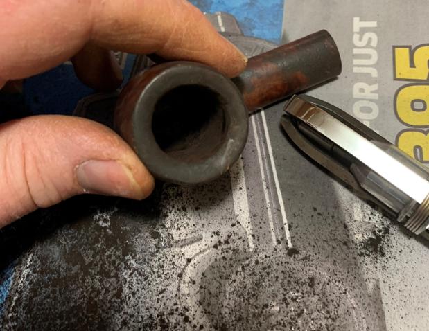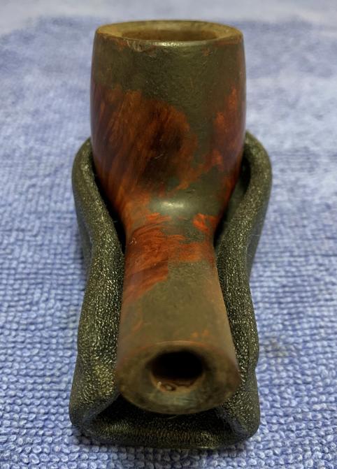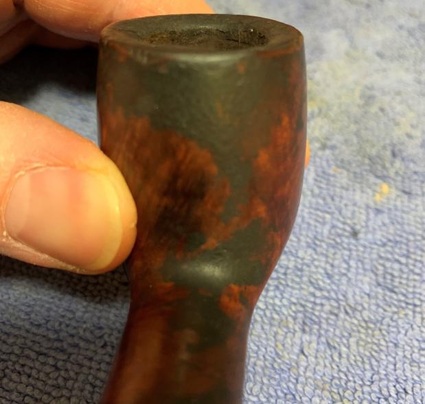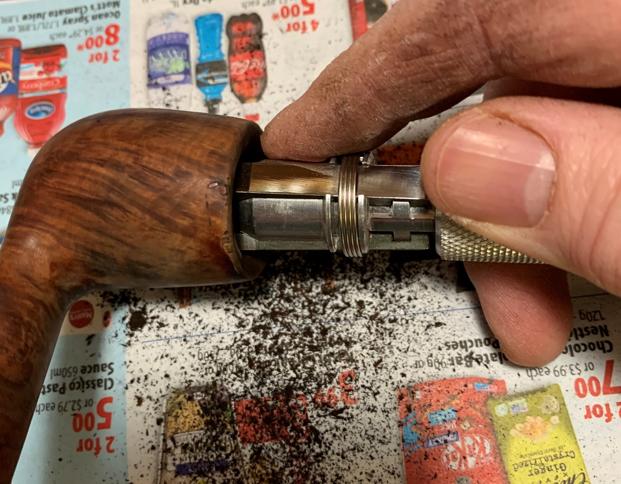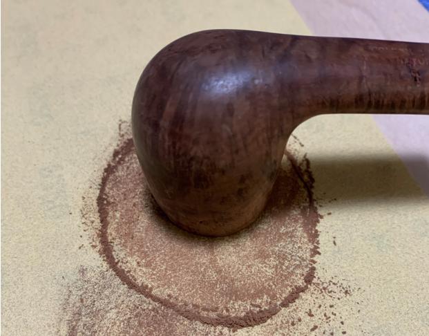 Back to the stummel – the banged up rim needed some serious attention. In order to minimize the impact of the damaged, I “topped” the pipe – that is to say, I gently and evenly sanded down the rim on a piece of 220-grit sandpaper. This successfully eliminated the damage, without altering the look of the pipe. Then I took a solid wooden sphere, wrapped sandpaper around it, and sanded thoroughly. This was to achieve on the inner part of the rim the same thing that I achieved by “topping” on sandpaper.