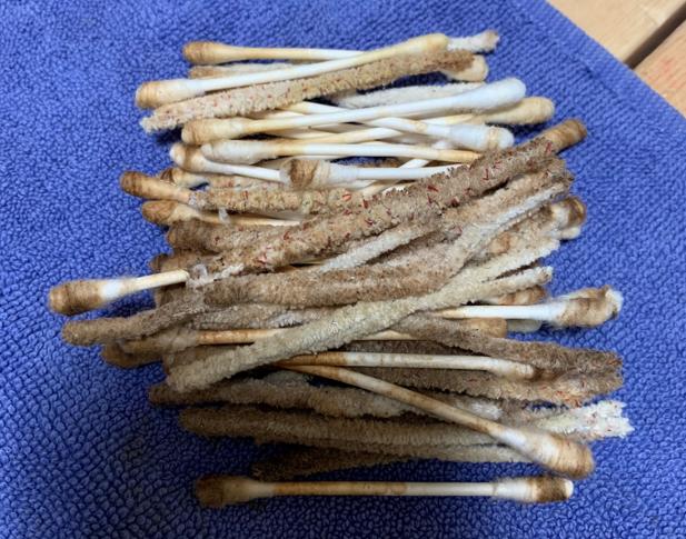 A de-ghosting session seemed in order to rid this pipe of the foul smells of the past. This de-ghosting consisted of thrusting cotton balls in the bowl and the shank, and saturating them with 99% isopropyl alcohol. I let the stummel sit for 24 hours. This caused the oils, tars and smells to leech out into the cotton. Finally, a relatively clean and fresh-smelling bowl emerged.