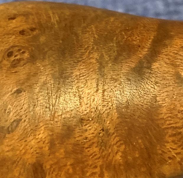 Furthermore, there was an ugly blotch of pink putty in a fill on the shank. What made this more complicated was that part of the fill went into the markings. Naturally, I intended to remove the pink putty, but if I removed it all, I would also remove part of the word “natural” on the shank. I had to decide which was worse (or better): a bit of putty with the marking intact or no putty with a wrecked marking. I opted for the former. I left a bit of putty, added some colour from my furniture markers, and filled in the remaining hole with cyanoacrylate adhesive. Neither option was perfect, but I think I made the right choice. After this, I used all nine Micromesh pads (1,500 through 12,000 grit) to remove the frustrating scratches in the wood and make everything smooth.