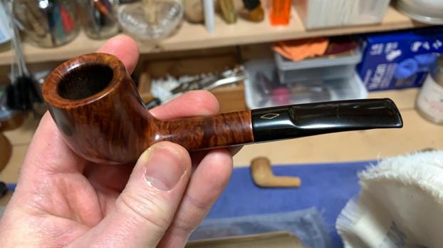 This pipe is a Golden Brebbia Natural 8006. It is a slightly bent billiard with an oval shank and stem. The Brebbia pipe company is named after the locality of Bosco Grosso di Brebbia in Lombardy, Italy. The company was founded by Enea Buzzi and Achille Savinelli in 1947, but they parted ways in 1953. Mr Savinelli went on to form his eponymous company, while Mr Buzzi kept the factory and created Maniffatura Pipe Brebbia. His family still run it today.