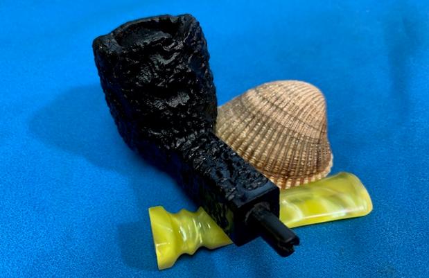 He took photos of the rim top and the stem. The photo of the rim top shows the incredibly thick cake in the bowl and the heavy coat of lava on the filling in the crevices and valleys of the heavily rusticated rim top. The stem photos show the oils and tars in the airway of the bright yellow stem and some tooth chatter and tooth marks.