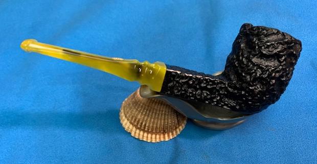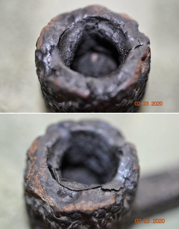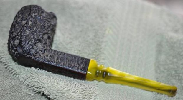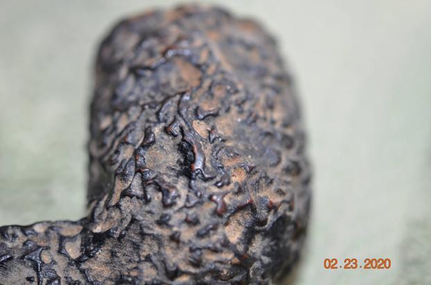 He took photos of the rim top and the stem. The photo of the rim top shows the incredibly thick cake in the bowl and the heavy coat of lava on the filling in the crevices and valleys of the heavily rusticated rim top. The stem photos show the oils and tars in the airway of the bright yellow stem and some tooth chatter and tooth marks.