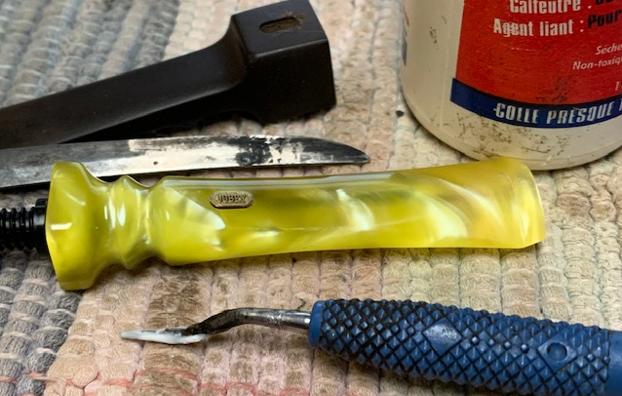 Now it was time to work on the pipe. I decided to start with the stem. I sorted through some of the pipes remaining for me to work on and I had this broken Jobey stem. I used a small pen knife to lift the brass logo out of the damaged stem to use on the yellow one. I put some white all purpose glue in the indentation on the stem top and used a small dental probe to press the brass logo into the spot it was missing. I wiped off the excess glue and pressed the edges down with the probe and I was happy with the look and fit of the “new” brass logo.