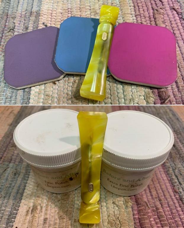 I sanded the stem surface with 220 grit sandpaper to remove the tooth marks and chatter and blend them into the surface of the acrylic. I started polishing the stem with 400 grit wet dry sandpaper.