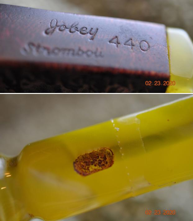 The next pipe on the work table is one that came to us from a fellow we have bought pipes from in Brazil, Indiana, USA early in 2020 and I am finally getting to it. It is a nice looking Jobey rusticated, square shank billiard with a fancy acrylic stem. It is stamped on the underside of the shank Jobey [over] Stromboli. To the right of that is the stamped shape number 440. The yellow acrylic saddle stem was missing the brass inlaid Jobey oval. The pipe has a heavily rusticated finish with deeper random craters carved in the rusticated surface. The finish was absolutely filthy on this one with grime and dust deep in the crevices. There was a heavy cake in the bowl and a heavy overflow of lava onto the rim top. There were some nicks or at least worn spots on the outer edge of the rim but the rustic carved rim top makes it hard to know if they deep or just worn. The stem had a blackened airway from the tobacco juices and it had some shallow tooth marks and chatter on both sides near the button. The stem was screwed onto the shank with the Jobey Link system which was in excellent condition. Jeff took some photos of the pipe before he did any clean up.