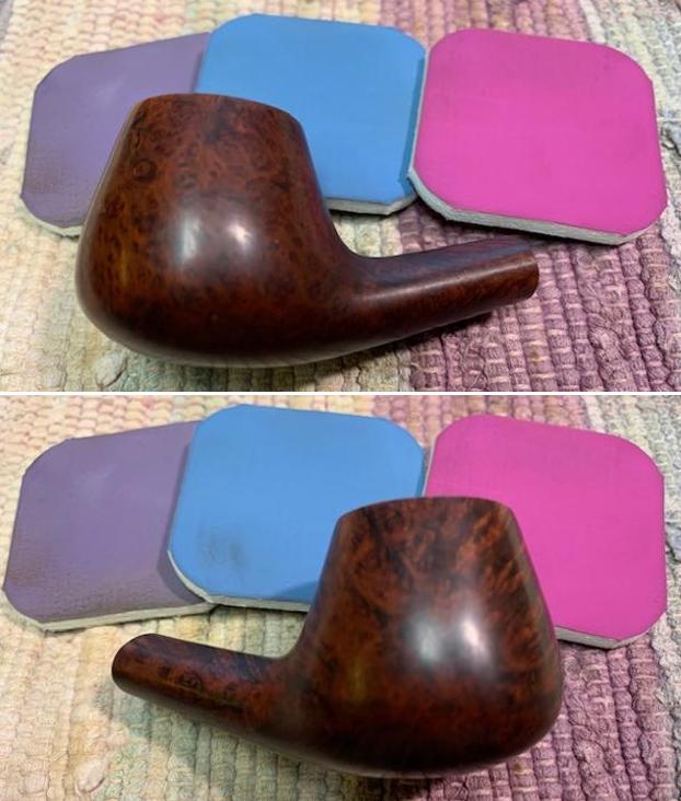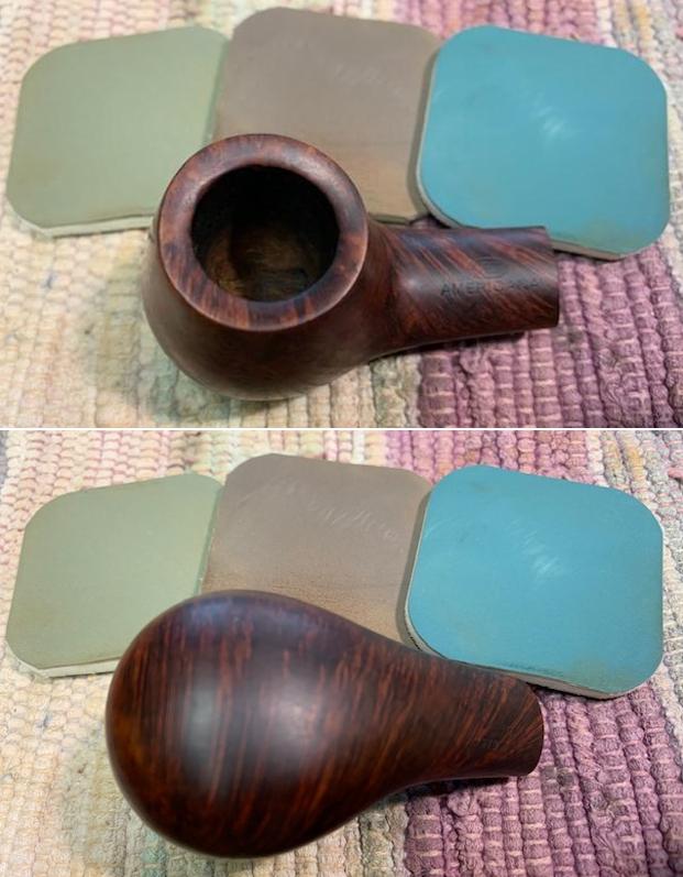 Jeff had cleaned up the pipe following his normal cleaning process. In short, he reamed the bowl with a PipNet pipe reamer and cleaned up the reaming with a Savinelli Fitsall Pipe Knife.  He scrubbed the smooth bowl with undiluted Murphy’s Oil Soap with a tooth brush. He worked over the lava and debris on the rim top and was able to remove it. He rinsed it under running warm water to remove the soap and grime. He cleaned out the inside of the shank and the airway in the stem with alcohol, cotton swabs and pipe cleaners. He scrubbed the stem with Soft Scrub and cotton pads to remove the debris and oils on the stem. He soaked it in a bath of Briarville’s Pipe Stem Deoxidizer to remove the oxidation. He rinsed it with warm water and dried it off. I took photos of the pipe once I received it. It really looked good.   I took close up photos of the stem and the rim top to show both how clean they were and what needed to be addresses with both. The rim top and bowl edges look very good. The stem looked better and the tooth marks and chatter were very visible. I took a photo of the stamping on the top and underside of the shank. You can see from the photo that it is readable. I removed the stem from the bowl and took a photo of the parts to give a sense of the beauty of the pipe. I decided to start my work on this pipe with the stem. I “painted” the stem with a Bic lighter to try and lift the tooth marks in the surface of the vulcanite. I was able to lift them quite a bit. I filled in the remaining marks with clear CA glue and set it aside to cure. Once the repairs cured I used a file to recut the edge of the button and reshape it. I sanded the stem surface with 220 grit sandpaper to remove the tooth marks and chatter and blend them into the surface of the acrylic. I started polishing the stem with 400 grit wet dry sandpaper. I polished the stem with micromesh sanding pads – 1500-12000 grit pads. I wiped it down with a damp cloth after each sanding pad. I used Before & After Pipe Polish – both Fine and Extra Fine to further polish the stem.    The tenon was drilled for a 6mm filter. I fit a Savinelli Balsa Wood Filter in the tenon and the fit is perfect. I am assuming it will take all 6mm filters without any issue.   I set the stem aside and turned to the bowl. I polished the briar with micromesh sanding pads – dry sanding with 1500-12000 grit pads. I wiped the bowl down after each sanding pad with a damp cloth to remove the dust and debris. The began to take on a deep shine.    I rubbed the it down with Before & After Restoration Balm. I worked it into the surface of the bowl with my fingertips to get it into the briar. The product works to clean, enliven and protect the briar. I let the balm sit for 15 minutes and then buffed with a cotton cloth to raise the shine.     Once again I am the part of the restoration that I always look forward to – the moment when all the pieces are put back together. I put the GBD Americana 1970 Diplomat back together and buffed the bowl and stem with Blue Diamond on the buffing wheel. I gave the bowl and the stem multiple coats of carnauba wax. I buffed the pipe with a clean buffing pad to raise the shine. I hand buffed it with a microfiber cloth to deepen the shine. It is fun to see what the polished bowl looks like with the grain peeking through the dark finish. The vulcanite saddle stem stands in contrast to the dark colours of the bowl. It is a light weight pipe that could be clenched and smoked while doing other things. Have a look at it with the photos below. The dimensions of the pipe are Length: 5 ½ inches, Height: 1 ½ inches, Outside diameter of the bowl: 1 ¼ inches, Chamber diameter: ¾ of an inch. The weight of the pipe is 40 grams/1.41 oz. This one will soon be on the British Pipe Makers Page on the rebornpipes online store. Thanks to each of you who are reading this blog. Remember we are not pipe owners; we are pipemen and women who hold our pipes in trust until they pass on into the trust of the next generation.