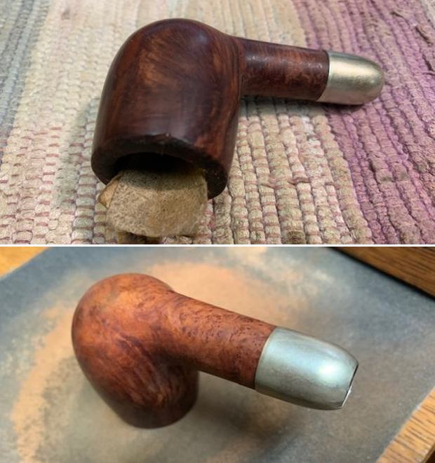 Every so often Jeff and I make an effort to meet somewhere and do a bit of pipe hunting. Back in October of 2019 we met in Southern Alberta and drove along the Queen Elizabeth Highway up to Edmonton. We stopped a lot of different antique shops and malls along the way to see what kind of luck we would have finding estate pipes. We picked up this pipe along with a few others at several Antique Malls in Edmonton. This one was a real mess with a very thick cake and heavy lava pouring from the bowl over the rim top. The was a crack in the right side of the bowl from the rim top down about 1/3 of the depth of the bowl. It was a hairline crack but it was visible even in the filthy condition we found the pipe in. However even with the grime ground in to the briar and the tarnished silver I knew that we were dealing with an old timer. I knew that MRC was related to GBD pipes so I was hooked. The stem was heavily oxidized and had tooth grooves on both side of the stem ahead of the button. There was wear on the button edges as well. The button itself also spoke of the pipe being an old timer because it was an orific button with a hole instead of a slot. Jeff took photos early in 2020 when he got to cleaning it up for us. The photos of what he saw are included below. There was a lot of damage to the outer edge of the rim and it was not clear what the rim top or inner edge truly looked like because of the thick cake and lava overflow. There was also a crack on the right side of the bowl about 1/3 of the depth of the bowl. It was hard to know at this point if it went through the bowl and on the rim top. Cleaning would reveal all! The stem was oxidized, calcified and had some deep tooth grooves on both sides from the button forward. There was also some damage on the top and under edge of the button itself. Jeff took photos of the sides and heel of the bowl to show the overall look of the grain and the condition of the bowl. In the first photo below I have encircled the crack in red on the right side so you can see it clearly. He took photos of the stamping on the shank and on the sterling silver ferrule. It is clear and readable. The MRC logo in the shield is on the left side of the shank and it is also on the ferrule. There is also an AO stamp followed by three hallmarks on the ferrule – an anchor, a rampant lion and an “m”. These help to date the pipe and identify the maker and city.I turned to Pipedia to help date the MRC (Marechal Ruchon & Cie) and connect the dots with GBD pipes (https://pipedia.org/wiki/Marechal_Ruchon_%26_Cie). I quote the section below that is pertinent form the site.