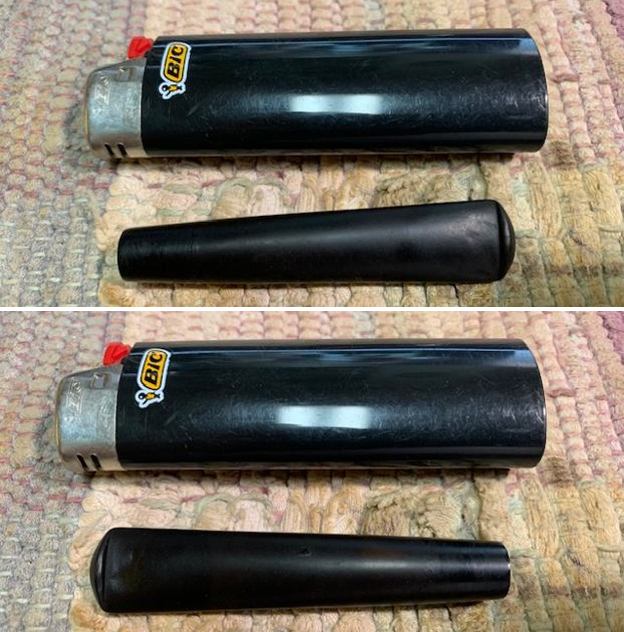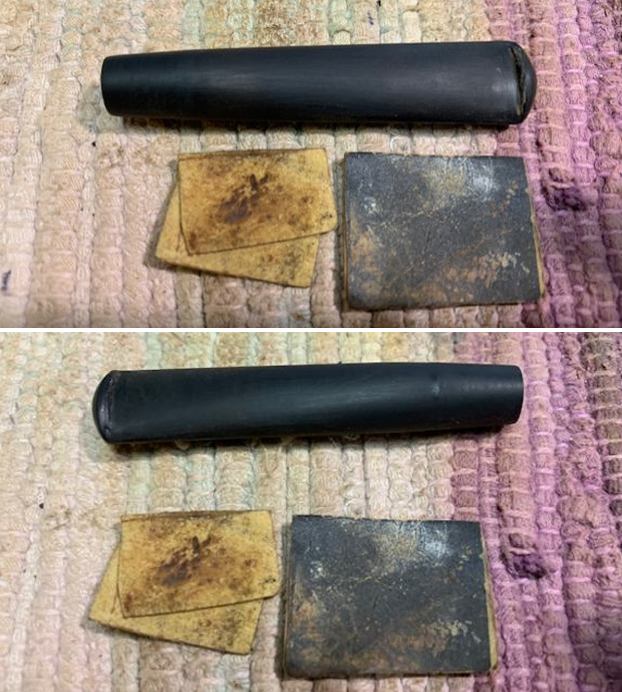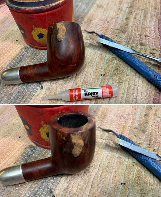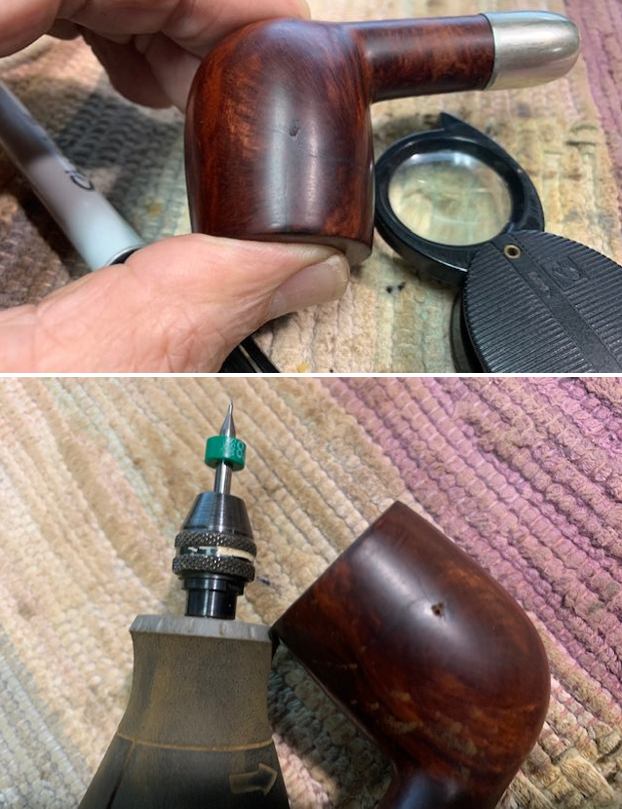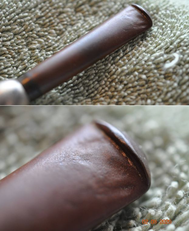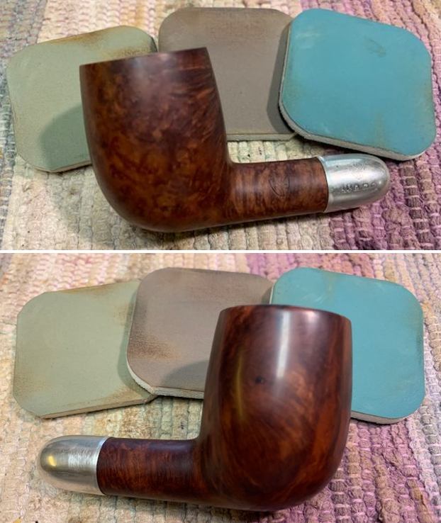 I turned to the British Silver Hallmark page to try and pin down the date for this silverwork (https://www.925-1000.com/british_marks.html). I have marked it with a red box on the chart that is below. The lower case “m” in the cartouche on the silver matches the one for 1911. So now I knew that I was working on a 1911 MRC pipe that was made for sale in England and bore the Birmingham silver. It really is a crossover pipe – French made by Marechal, Ruchon and Company Ltd. in Paris with British silver work made in Birmingham!Armed with the information that I had gleaned from my research, I turned my attention to the pipe itself. Jeff had done a great cleanup on the pipe. He reamed the bowl with a PipNet pipe reamer and followed up with a Savinelli Fitsall pipe knife to remove the cake. He scrubbed out the mortise and the airway in the shank and the stem with alcohol, cotton swabs and pipe cleaners. He scrubbed the bowl exterior with a tooth brush and Murphy’s Oil Soap to remove the grime on the finish of the bowl and the lava from the rim top. He rinsed it under running water. One of the benefits of this scrub is that it also tends to lift some of the scratches and nicks in the surface of the briar. He dried it off with a soft cloth. The damage on the rim top and inner and outer edges is very visible in the photos below. He cleaned the internals and externals of the stem with alcohol, pipe cleaners and cotton swabs. He soaked the stem in Briarville’s Pipe Stem Deoxidizer and rinsed it off with warm water and cleaned out the airway in the stem with alcohol. When I received it the pipe looked very good. I took a photo of the rim top and stem to show the condition. The rim top and the inner edge of the bowl were in rough condition. The top of the rim was beat up pretty badly with nicks and chips. The inner and outer edges were rough and the bowl was out of round. It was also clear that the crack on the right side of the bowl went onto the top. The stem was vulcanite and there were deep tooth marks and chatter on both sides ahead of the button.The stamping on the pipe and the silver ferrule is clear and readable as noted above. I removed the stem from the shank and took a photo of the pipe to give a sense of the whole.I started my work on this pipe by dealing with the damaged rim top and inner edge of the bowl. I used a folded piece of 220 grit sandpaper to smooth out the inner edge and bring it back to round. I topped the bowl to smooth out the damage on the rim top. I did not remove much of the briar but conservatively dealt with the damage. The cleaned up rim top looked very good.         Now it was time to deal with the crack in the bowl on the right side. I marked the end of the crack on the briar with a Sharpie pen as I viewed it through a lens. I used the mark to guide me when I drilled the end of the crack with a microdrill bit on the Dremel. I filled in the drilled hole with briar dust and clear CA glue. I spread it over the entirety of the crack on the side and the rim top. Once the repair had cured I used a small flat file to flatten out the repair and bring it down to the surface of the briar. I blended it into the surface of the briar with a folded piece of 220 grit sandpaper. I was happy with the look of the repair.I polished the briar with 1200-1500 micromesh sanding pads and wiping it down with damp cloth after each sanding pad. As I worked through the cycle of pads the shine developed with each change of pad. The pipe looks very good.      I polished the silver ferrule with a jewelers cloth to give it a sheen and protect it from further tarnishing. I rubbed the bowl and shank down with Before & After Restoration Balm. I worked it into the surface of the bowl sides and shank with my fingertips to clean, enliven and protect the briar. I let the balm sit for 10 minutes, then buffed with a cotton cloth to raise the shine. The Balm did its magic and the grain stood out on the briar. I set the bowl aside and turned my attention to the stem. I “painted” the tooth marks/grooves with the flame of a lighter. I was able to lift them considerably. I filled in the remaining marks with clear CA glue. Once the repair cured I used a small file to flatten it out and begin the blending process to make it disappear into the surrounding vulcanite. I followed that by sanding the stem with 220 grit sandpaper and started the polishing with 400 grit wet dry sandpaper. I polished it with micromesh sanding pads – 1500-12000 grit pads. I wiped it down with Obsidian Oil after each sanding pad. I used Before & After Pipe Polish – both Fine and Extra Fine to further polish the stem. The photos below show the polished stem. This 1911 MRC (Marechal, Ruchon & Cie) Military Bit Billiard with a vulcanite stem is a great looking pipe now that it has been restored. The rich browns of the stain made the grain come alive with the polishing and waxing. I put the stem back on the bowl and carefully buffed the pipe with Blue Diamond on the buffing wheel using a light touch on the briar. I gave the bowl and the stem multiple coats of carnauba wax on the buffing wheel and followed that by buffing the entire pipe with a clean buffing pad. I hand buffed the pipe with a microfiber cloth to deepen the shine. The finished 1911 MRC Billiard really is a beauty and fits nicely in the hand and looks very good. Give the finished pipe a look in the photos below. The dimensions of the pipe are Length: 5 ¼ inches, Height: 2 inches, Outside diameter of the bowl: 1 ¼ inches, Chamber diameter: ¾ of an inch. The weight of the pipe is 1.34oz./38grams. I am still debating on whether to keep this one or sell it… It fits nicely in my collection of older pipes. Thanks for reading this blog and my reflections on the pipe while I worked on it. There are many more to come!