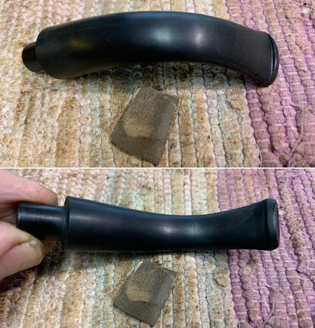 I set the bowl aside and turned my attention to the stem. I “painted” the surface of the hard rubber stem with the flame of a lighter to lift the tooth marks as much as possible. I was able to lift them significantly. I filled in the remaining one on the top side next to the button and on the underside in the same place with clear super glue. Once it cured I sanded it smooth with 220 grit sandpaper.