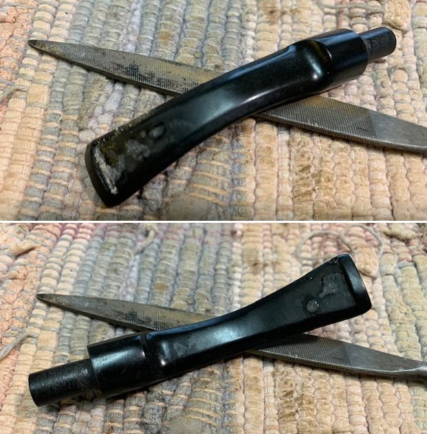 I set the bowl aside and turned my attention to the stem. I “painted” the tooth marks and chatter on the stem surface with the flame of a lighter to try and raise the dents. It worked very well and the majority of them came up. The few that remained I filled them in with clear CA glue and set it aside to cure. Once it cured I used 220 grit sandpaper to sand out the tooth chatter and marks on both sides of the stem. I used a small file to flatten out the repairs and reshape the button edge. I started to polish it with 400 grit wet dry sandpaper. The stem is looking much better.
