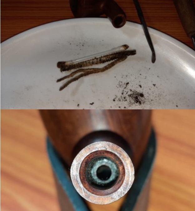 Next, I cleaned out the internals of the shank and mortise. Using my dental tool, I scraped out all the dried oils, tars and gunk that had accumulated in the draught hole and on the walls of the mortise. I finished the cleaning by running a few pipe cleaners dipped in isopropyl alcohol through the mortise. I shall continue with further cleaning of the shank internals when I clean the internals with cotton and alcohol bath and further during external cleaning of the stummel surface.