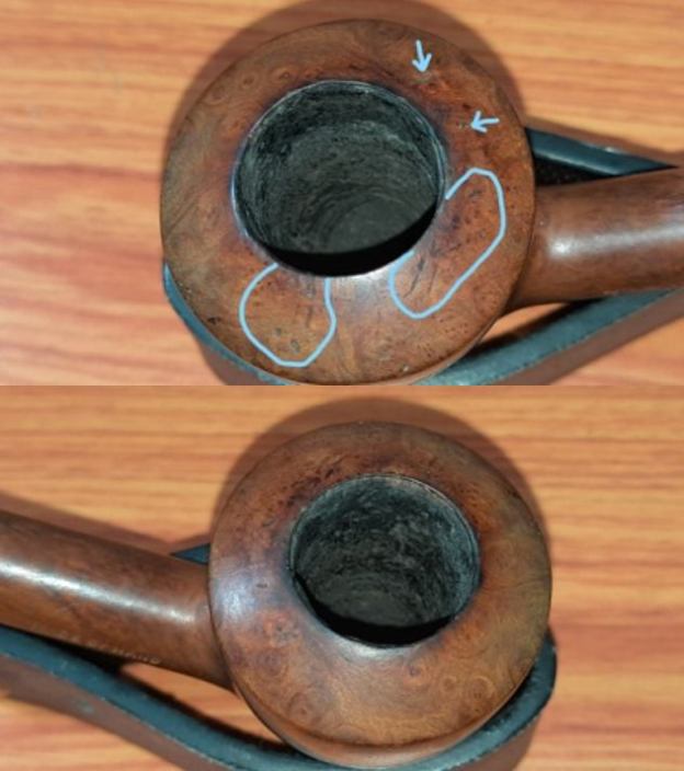 A thin and even layer of cake is seen in the chamber; however, the cake is very hard. The rim top surface is sans any overflow of lava, dirt, dust and grime, though a number of dents and dings (indicated with pastel blue circles and arrows) can be seen on the outward sloping rim surface. The exact condition of the inner walls of the chamber will be known once the cake has been taken down to bare briar. The chamber odor is strong and should be addressed to some extent once the cake has been taken down and the shank internals have been thoroughly cleaned. The stummel feels solid to the touch and I do not foresee any major issues with the condition of the chamber walls.