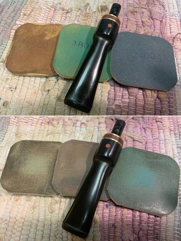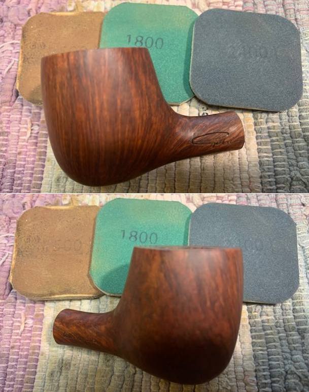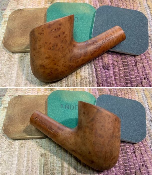 Now, with the damage repaired on all five pipes, it was time to sand down the stummels. Just like the stems, I used all nine Micromesh pads (1,500 through 12,000 grit) to sand everything smooth on the three briar pipes (I did not sand the cherrywoods). A light application of Before & After Restoration Balm brought out the best in the stummels’ grain