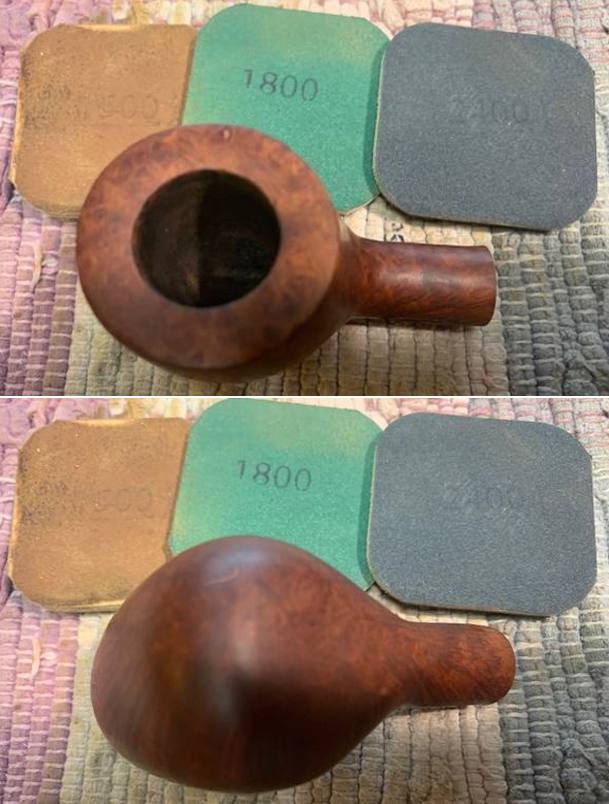 There was a great deal of damage to the rims of all the stummels – and that also needed to be addressed. In order to remove the lingering bits of lava, fix any nicks, and tidy up the look, I “topped” the pipes – that is to say, I gently and evenly sanded down the rims on a piece of 220-grit sandpaper. This effectively removed the lava and the damage, without altering the look of the pipes. However, some needed more attention than others. The two cherrywood pipes were straightforward enough, but a fair amount of work was needed on the other three.