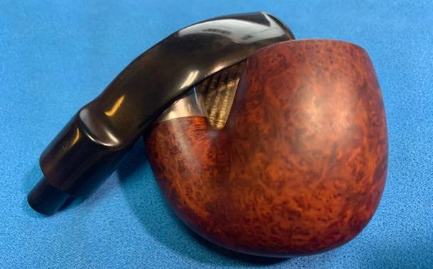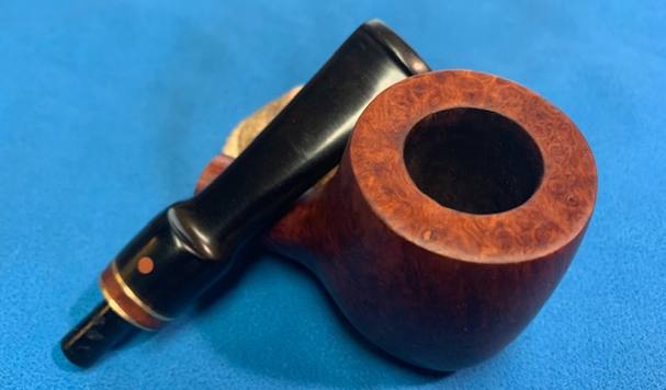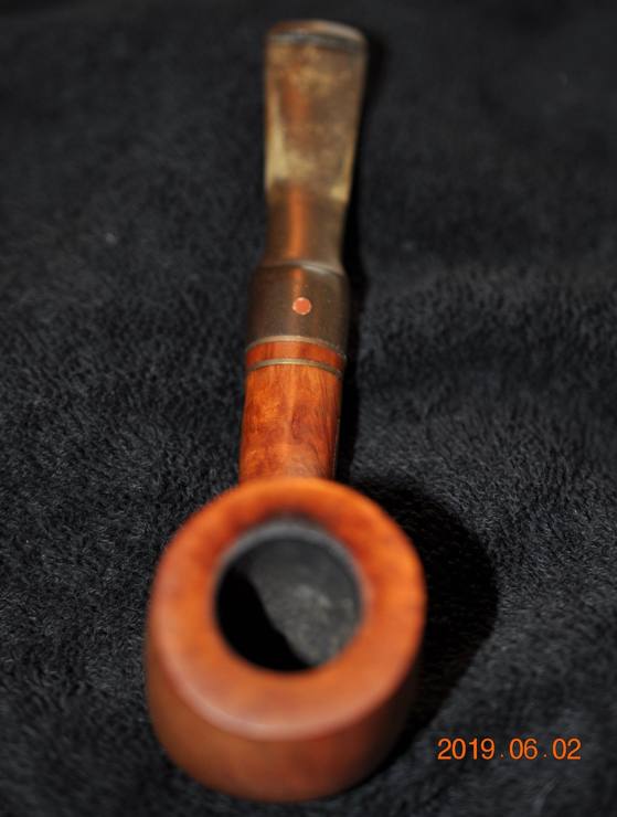The Savoy had a large valley running along the rim of the bowl (not to mention some considerable burning). A combination of techniques was used to sort this out. I topped the stummel to start, but then I took a solid wooden sphere, wrapped sandpaper around it, and sanded it thoroughly. This was to achieve on the inner part of the rim the same thing that I achieved by “topping” on sandpaper. I then built up the remaining wound with a mixture of briar dust and cyanoacrylate adhesive. I was quite pleased with the results. Finally, I added a brass ferrule to the end of the shank and glued it in place. It gave the pipe a snazzy look.