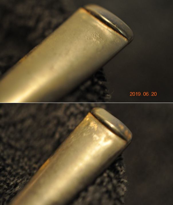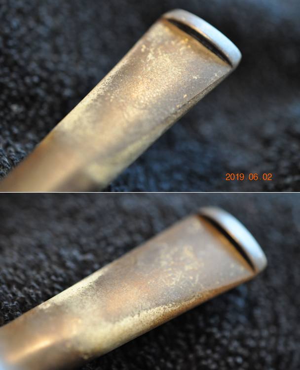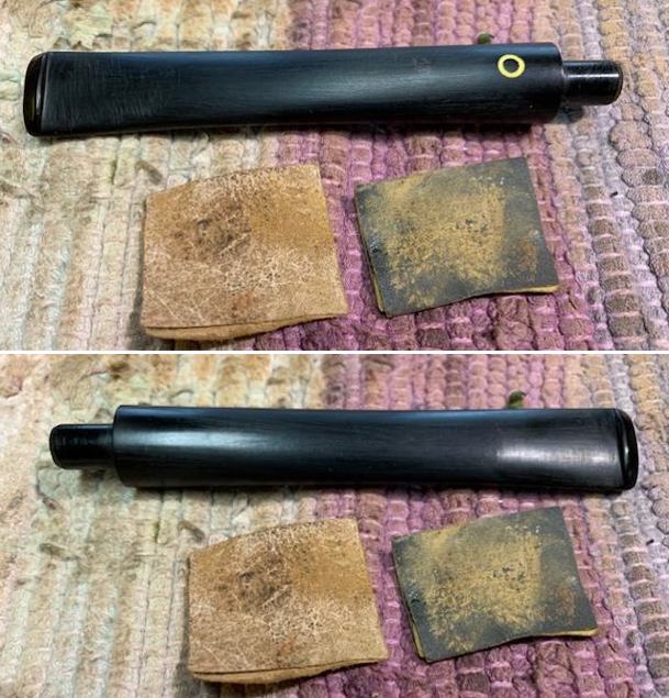 On the two pre-existing stems, I took a BIC lighter and ‘painted’ them with flame in order to lift the tooth marks. This was reasonably successful in raising the dents. Then, I cleaned out the insides of the stems with pipe cleaners and isopropyl alcohol. They were terribly dirty and I went through a large number of pipe cleaners in order to clean them up. Once this process was done, the stems went for an overnight soak in the Before & After Hard Rubber Deoxidizer. The following day, I cleaned all of the de-oxidizing sludge off with alcohol, pipe cleaners, et cetera. The oxidation had migrated to the surface and would be fairly straightforward to remove. I scrubbed vigorously with SoftScrub on cotton pads to remove the leftover oxidation.