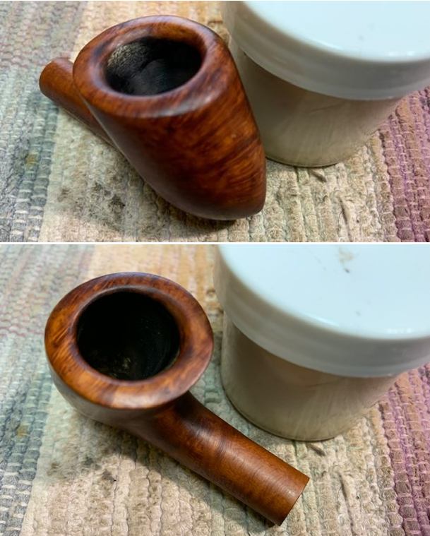 The Brigham was also tricky, but for a different reason. The Brigham had what I like to call a “broken nose”. The front edge was smashed in and would need to be built up. More than that, the repair would need to be rusticated so as to match the original rustication of the pipe. I am always worried about this sort of work because I dread the possibility of not getting the match right. In this case, I topped the Brigham first, but only slightly – just enough to make it neat and tidy. Then I built up the edge with a mixture of briar dust and cyanoacrylate adhesive. Then, I topped it a second time in order to even out the repair with the rim. Finally, I got out my Dremel and used that to rusticate the pipe’s “nose”. The results were quite good.