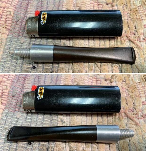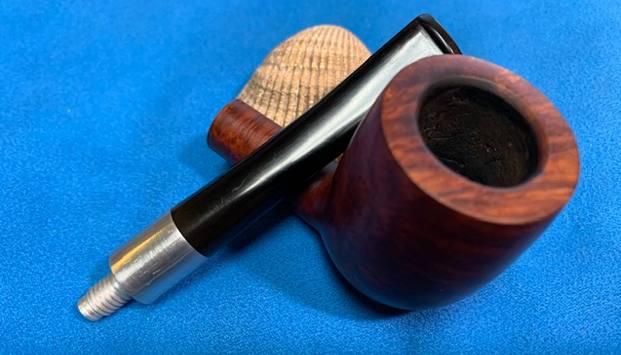 The next photo, even though it is out of focus, shows the threaded tenon and aluminum extension on the stem rather than the shank. Quite a surprise when you consider the information I included above. I would say that this is not a Byford system pipe as noted in the early paragraphs but a later model that used the look but not the system.