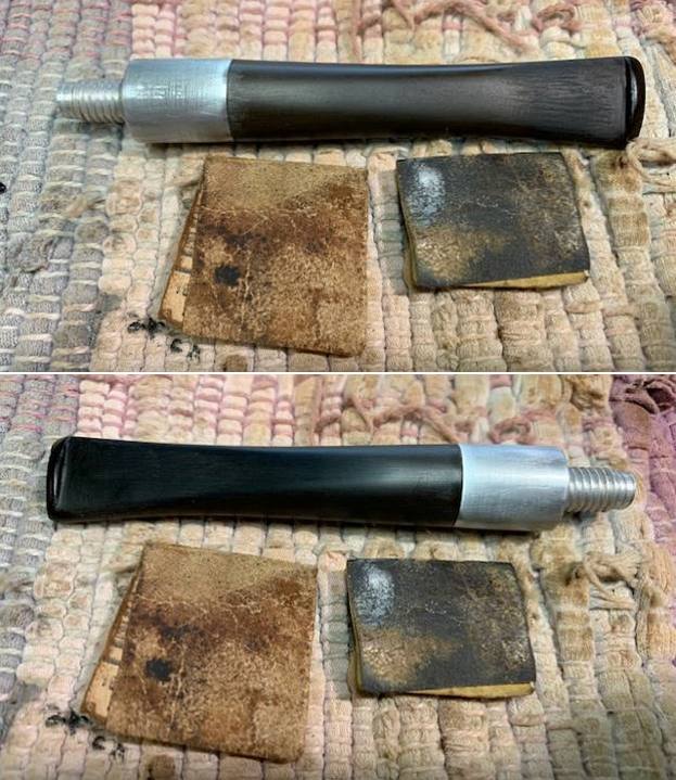 I “painted” the tooth marks on the stem with the flame of a lighter to lift the tooth marks as much as possible. I filled in what remained with clear CA glue. I used a small file to flatten the repairs and blended them into the surface of the stem and removed some of the deeper scratches in the aluminum with 220 grit sandpaper. I started the polishing with 400 grit wet dry sandpaper.