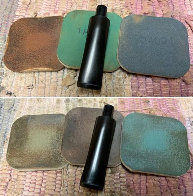I polished the vulcanite stem with micromesh sanding pads – 1500-12000 grit pads. I wiped it down with a damp cloth after each sanding pad. I used Before & After Pipe Polish – both Fine and Extra Fine to further polish the stem.
