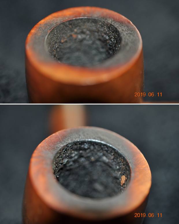 He took photos of the rim top and bowl to give a clear picture of the thickness of the cake and the lava on the rim top. The lava was thicker toward the back of the rim and there were remnants of tobacco on the walls of the thickly caked bowl. He also took photos of the top and underside of the stem to show the chatter and tooth marks. The stem is also oxidized.