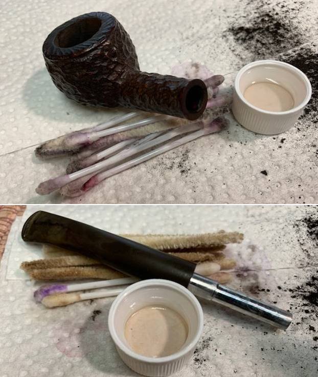 I scrubbed out the internals with 99% isopropyl alcohol, pipe cleaners and cotton swabs until the shank and the airway into the bowl and the stem were clean. You will notice that there was some red stain that came out of the inside of the shank with the cleaning.